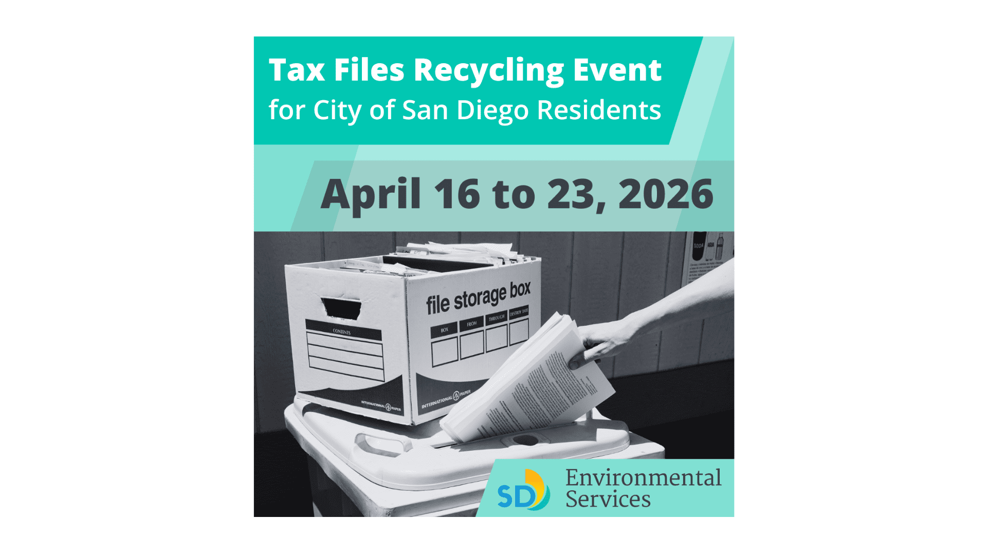 If you’ve just finished filing your latest tax return and are wondering how to safely dispose of old tax files, the City of San Diego’s free Tax Files Recycling Event is for you! City of San Diego residents can drop off documents in secured bins at the Miramar Recycling Center, and they will be shredded and recycled.