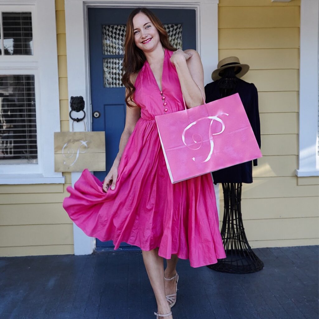 With a degree in fashion business Sophie “Phee”, Hague spent a decade immersed in the London luxury fashion & lingerie industries before moving to San Diego where she founded her sustainable fashion events and services brand Positive Phee. After researching the current fashion cycle and the damage that fast fashion has done to our society & environment, Sophie was motivated to explore a niche for circular fashion events, sustainable styling, and upcycling. After 4 years in business, Positive Phee is best known for her unique “Sip & Style” community events where women pay a flat “Phee” to fill a bag with carefully curated “like new” clothing and enjoy a drink of choice.